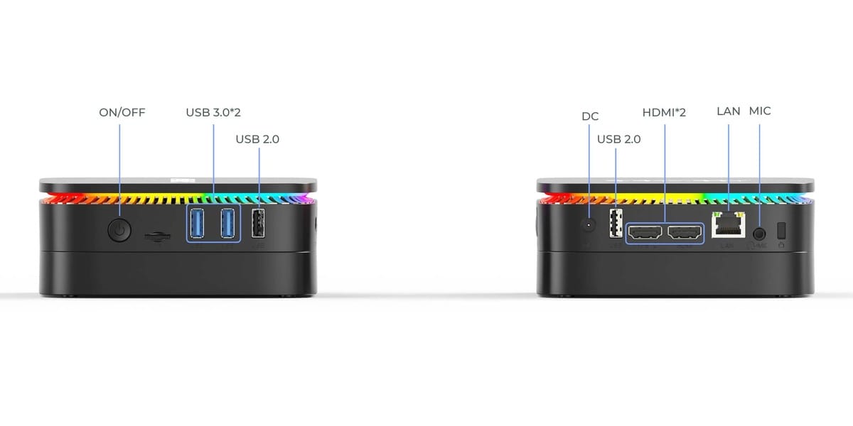This Mini PC boasts a sleek and compact design with sturdy construction, complimented by attention-grabbing RGB lighting effects that highlight its unique aesthetics.