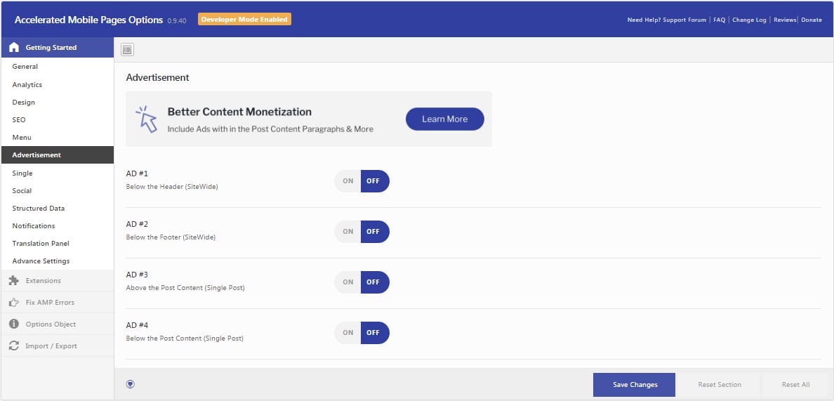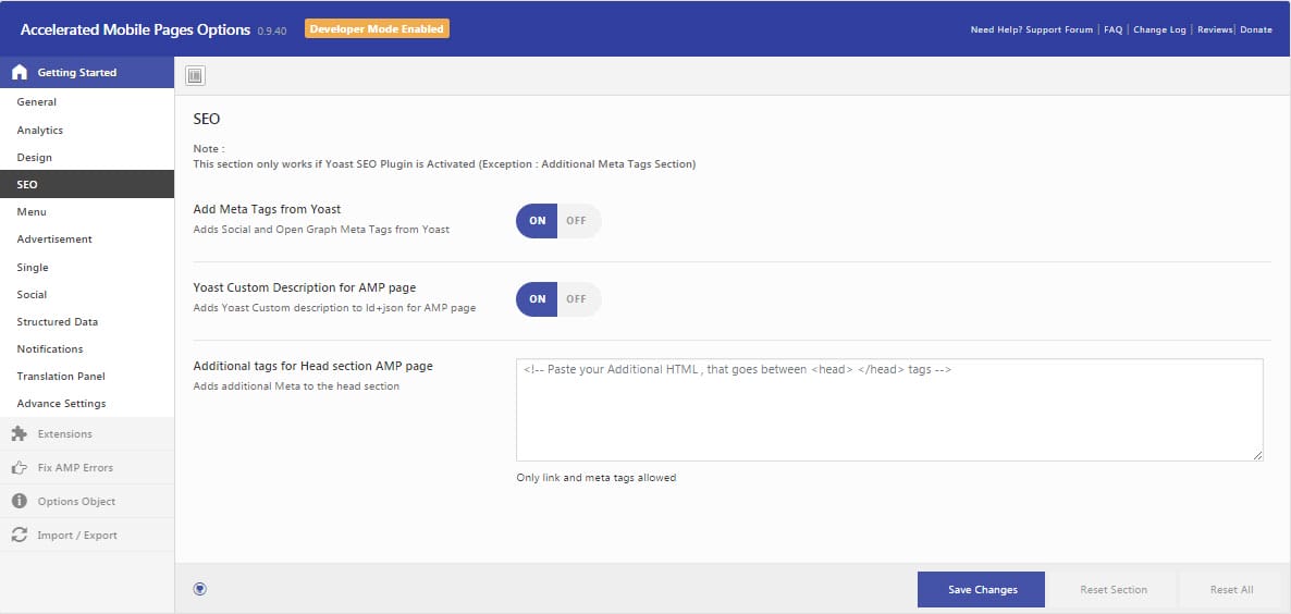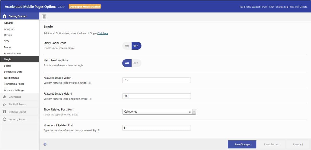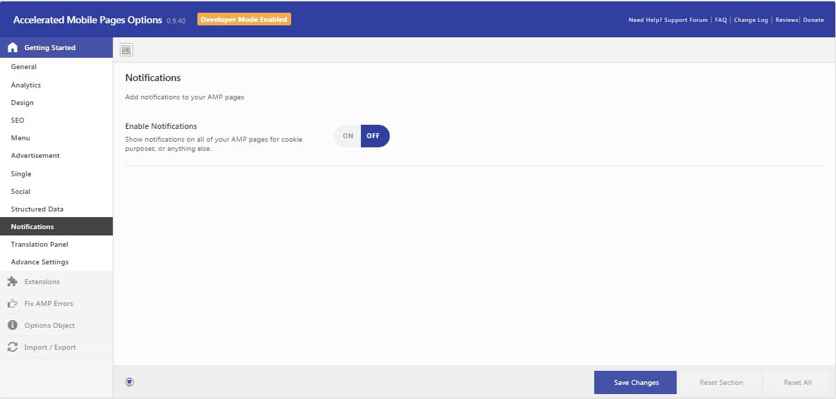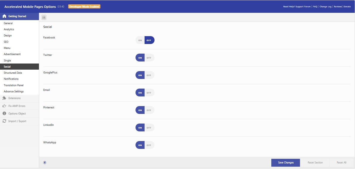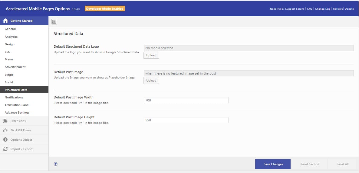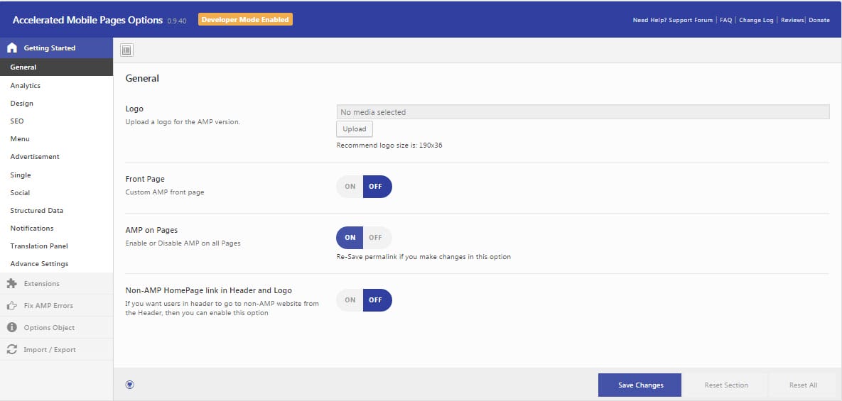 You can organize general settings such as logo custom amp front pages as well as enable or disable amp for all pages from the General settings.