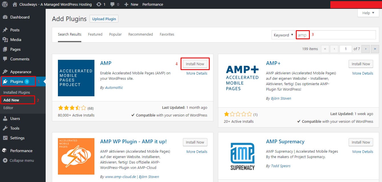 From your “WordPress Admin Panel”, navigate to “Plugins >> Add New.” In the top right search bar, search for “AMP” and click on “Install Now.” After installing, click on “Activate Plugin.” For reference check the image below.