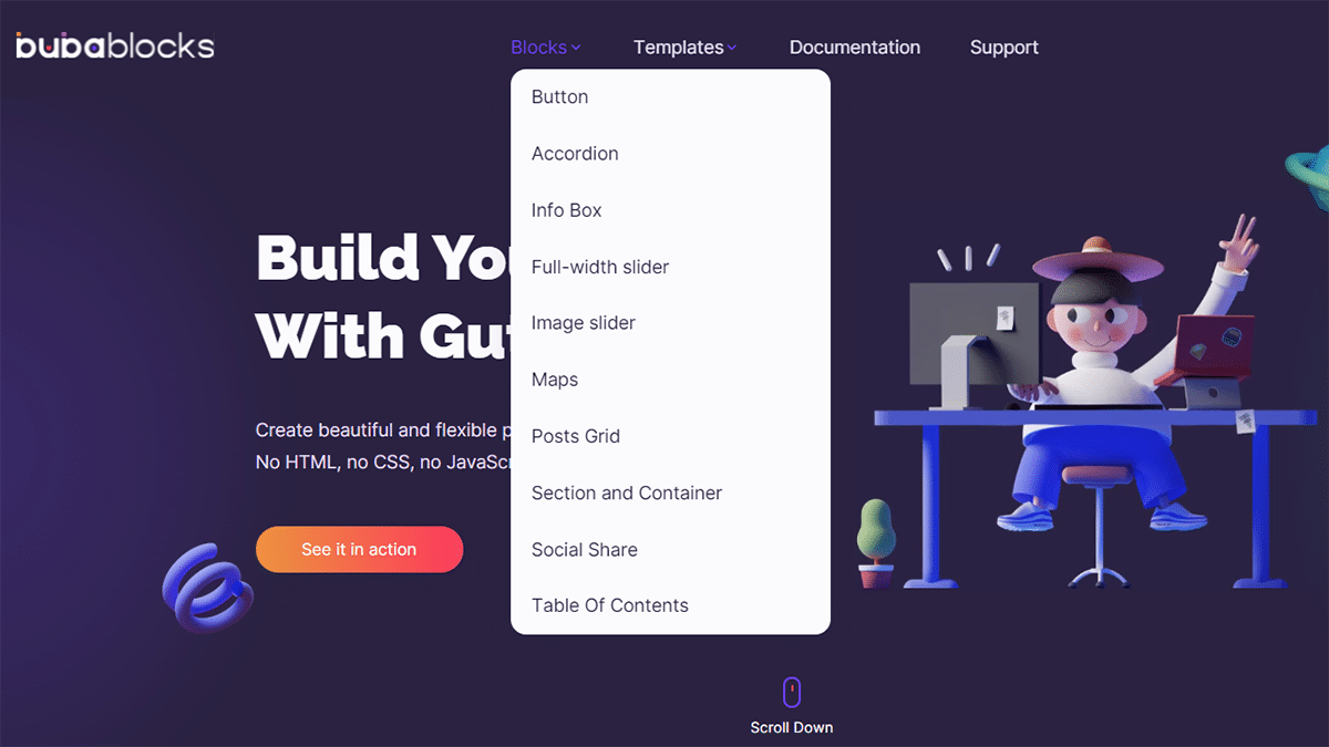 Using Buba Blocks also allows users to add animation to their web pages. Full-width slider block allows users to add background to the slides, add slider animation, auto-play option, adjust the speed of the slider, add icons to the slider. The slider spans the entire width of the page.