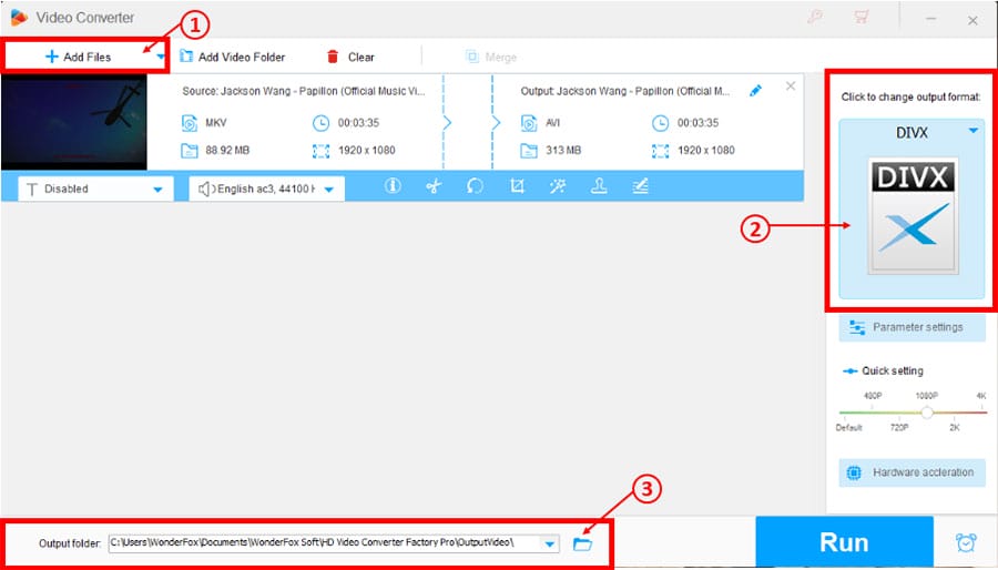 - Step 3: Select output folder which you want to store your converted files and click “Run”. When it is completed, open the output folder you will the DIVX video.