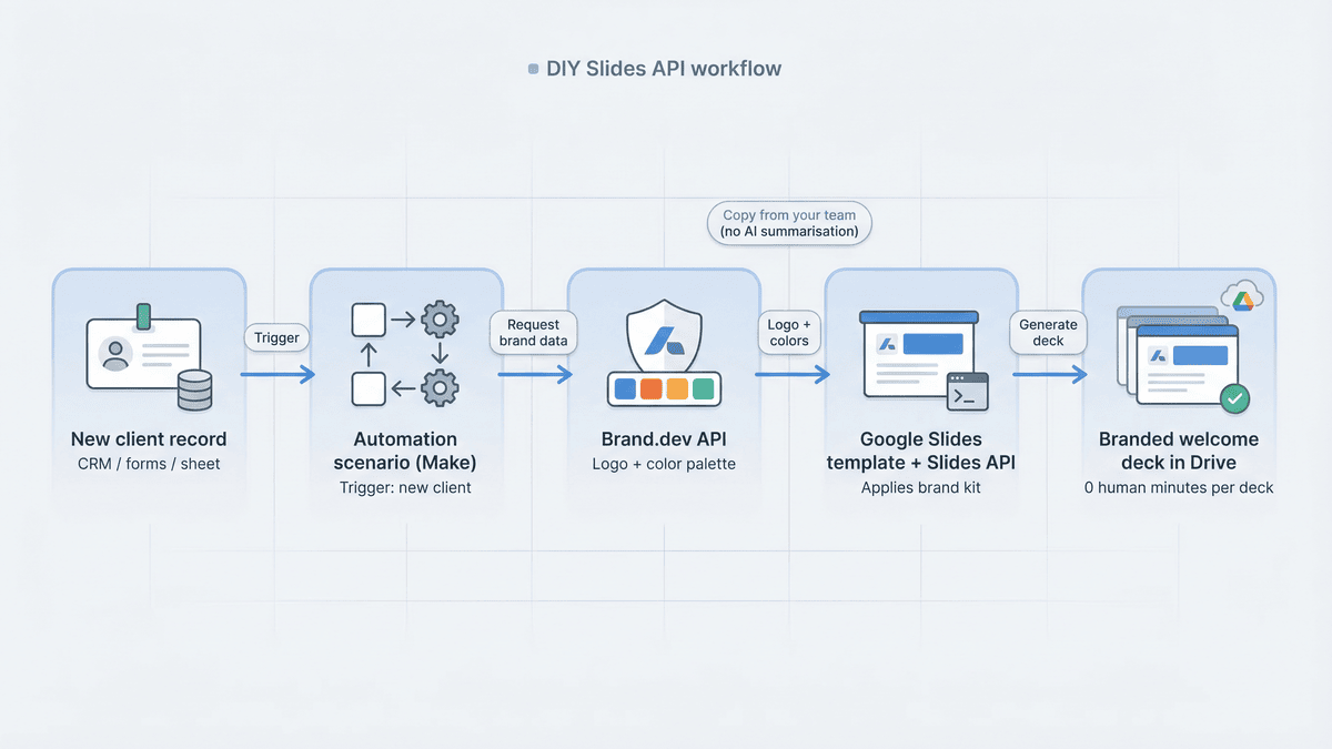 Here is the high-level flow: a new client record triggers a Make scenario. The scenario calls Brand.dev’s API to pull the client’s logo and color palette, then feeds that data into a pre-designed Google Slides template through the Slides API. Seconds later, a fully branded welcome deck lands in Drive, ready for account managers to tweak text and hit send.