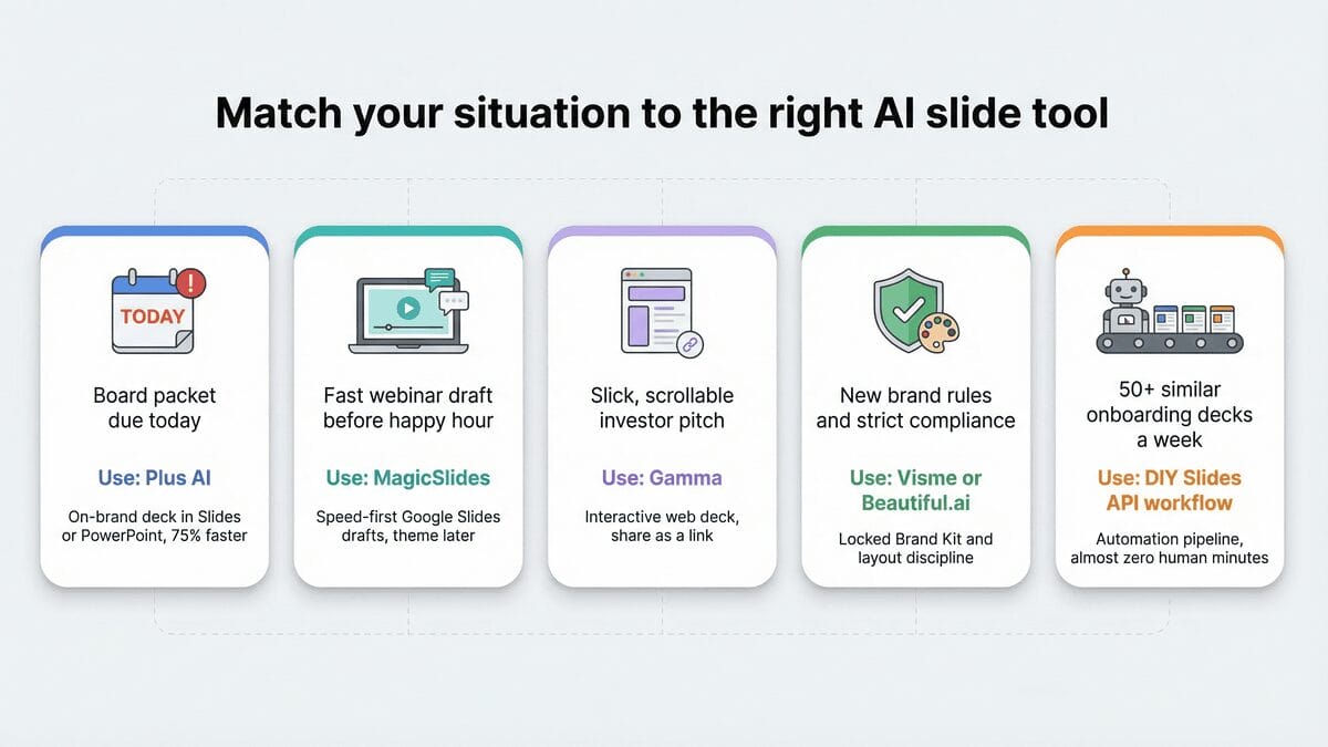 Use MagicSlides when pure speed beats perfect polish, and when your team works exclusively in Google Workspace. With a two-minute branding pass, you can move from document to presentation before the next Slack ping.