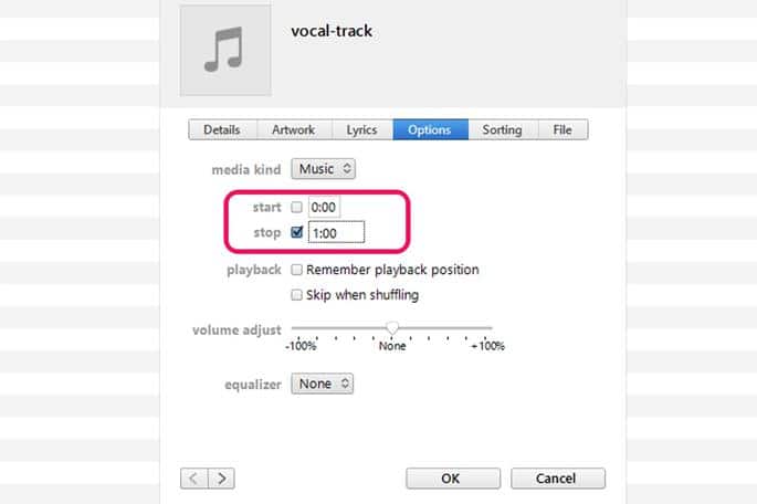 Play the music and remember the specific time you want to start and end. Then click the “My Music” button to select the “Get Info” option to open the “Vocal-Track” window. You can check the “Start” option to set the start time of the audio and select the “Stop” option to adjust the end time of the audio. And click the “OK” button to save the adjustment.