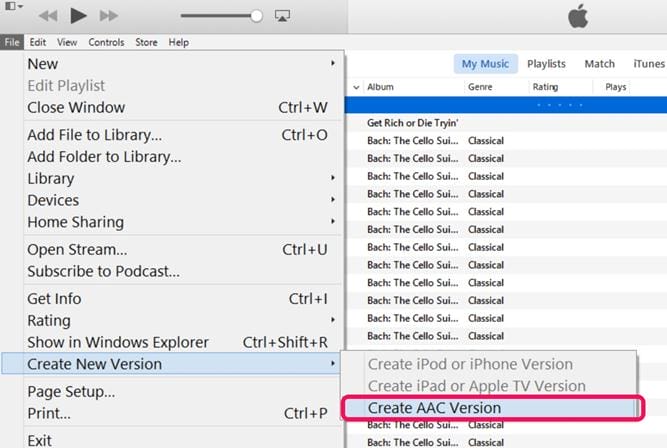 Click the “File” button and select the “Create New Version” option. Then choose the “Create AAC Version” to save your MP3 files in M4A format.