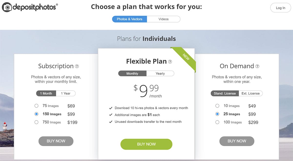 It lets you download ten high-resolution images and vectors each month. If you have any unused downloads during a specific month then the credits will roll over to the next month. This plan charges $9.99 if you are going for monthly payment. You can opt for a yearly plan to get a discount of 20%. After consuming all your monthly downloads, you will be charged $1 per additional image.