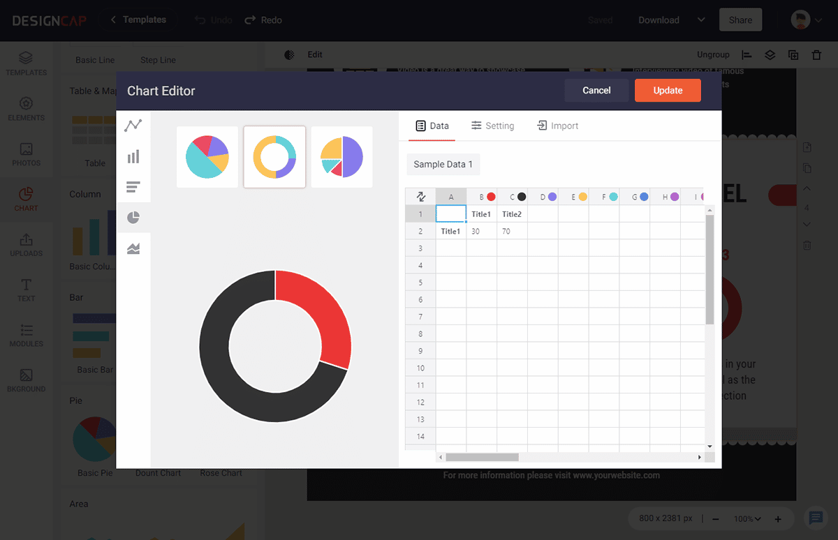 The chart tool in DesignCap is pretty talented. It’s very smart to import your data directly from XLS, XLSX, or CSV files. You can simply adjust the date of every value, number, and title or change the text color, fonts, and size of the data. This is what attracts me very much.