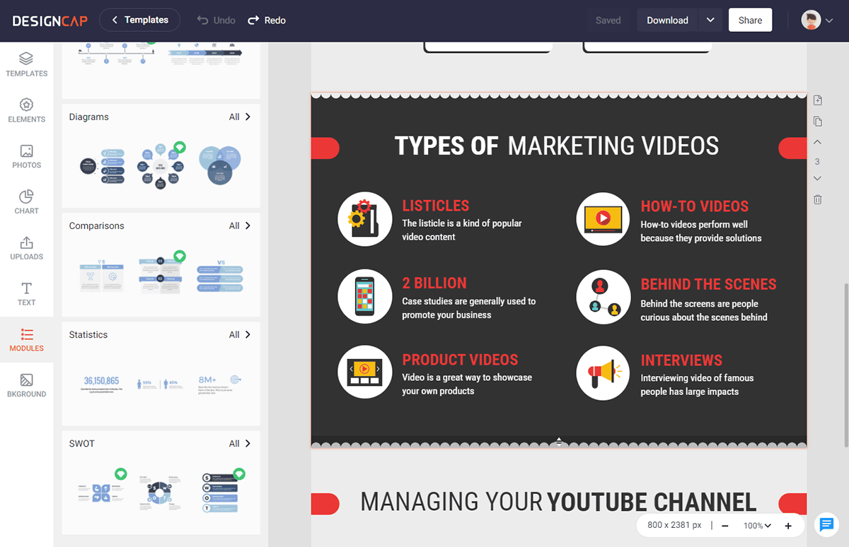 This is another tool that I love most. It’s pretty convenient to organize every piece of info on the infographic clearly and quickly. There is a wide selection of unique types for us to choose from, such as Diagrams, Timelines, Steps, Statistics, comparisons, etc.