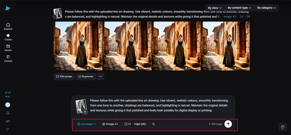 After you have logged in to your Dreamina account, you will proceed to the AI Image website by clicking the plus sign, where you will upload your black-and-white image. Once your image has been displayed, you will write the prompt describing how you wish the colors to look.
