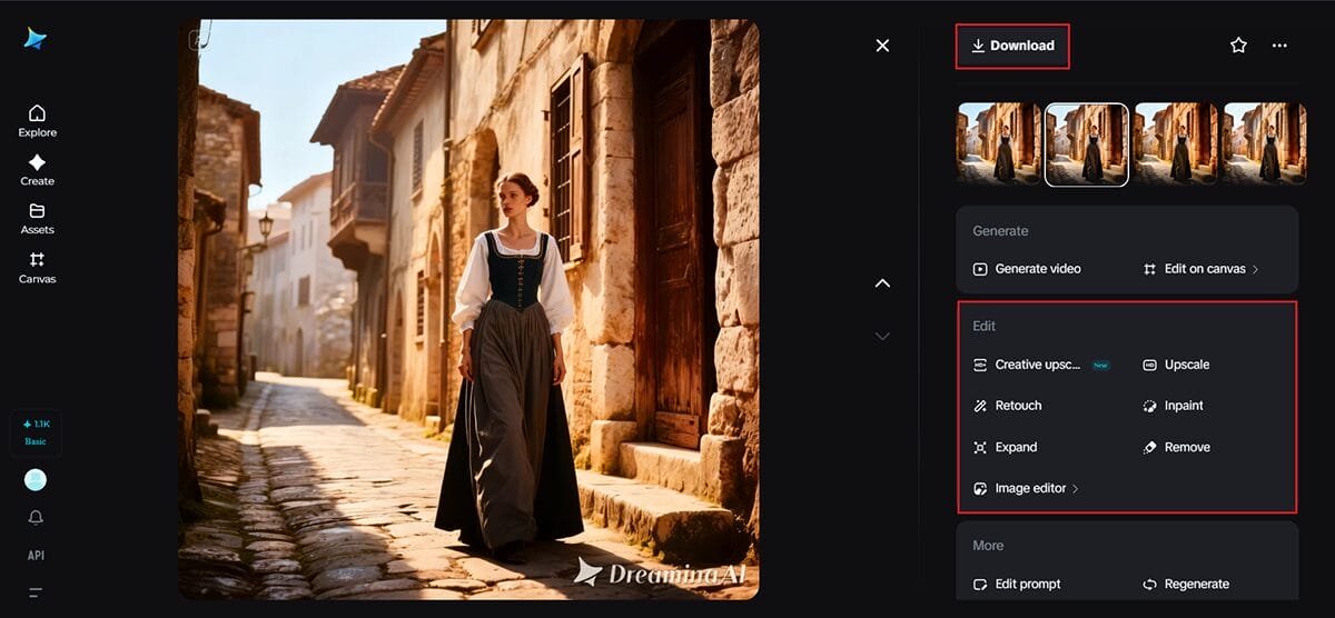 Browse through the images that Dreamina produces and see which ones are closer to the image that you had in your mind. To refine details, you can simply use the editing software tools on the right panel, either by refining small areas or making tone corrections if these need to be done. Once satisfied, click Download at the top to save your colorized photo and start using it in your projects.