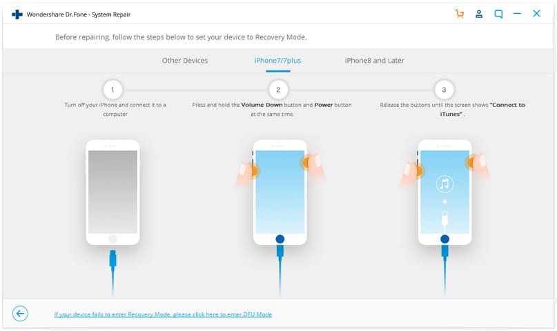 Step 6: Just in case, it doesn’t show your iPhone information, it means your phone is not detected by Dr.Fone app. For this, you have to do one additional step. Put your phone in DFU mode and then follow the required instructions.