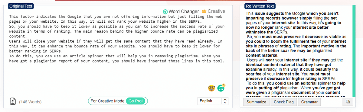 Sometimes plagiarism reports find some minor matches that are unintentional from your side. To fix this, you can use an article spinner that will help you in rewriting plagiarized content. When you have got a plagiarism report of your content, you should have inserted those lines in this tool.