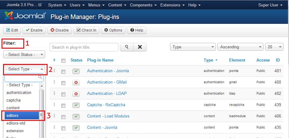 Step 3: On the Plug-in Manager page you can find one drop-down “Filter” option called “Select Type“. From the drop-down list choose “editors“. (As shown in below picture).