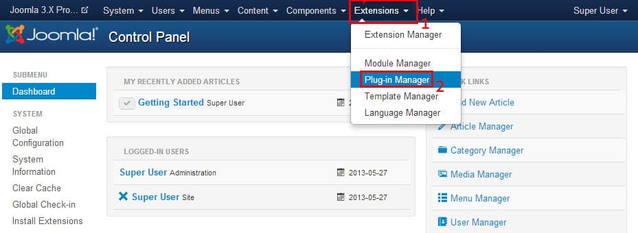 Step 2: Go to “Extensions” => “Plug-in Manager” from the top menu. (As shown in below picture).