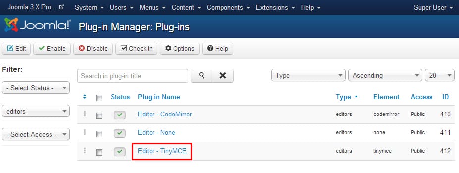 Step 4: Now the Plug-in Manager page will list all available editors. From the list click on the “Editor – TinyMCE“. (As shown in below picture.)