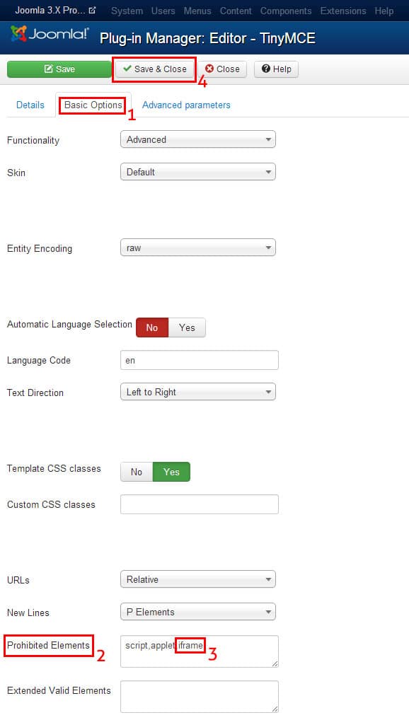 Step 5: Now on the edit page go to “Basic Options” tab. Under the “Basic Options“, almost at the bottom, you can find one option called “Prohibited Elements“. You can see “iframe” is listed here. Remove “iframe” from that field. Then click on the “Save & Close” button at the top to save your changes and close the edit section. (Check the below picture for better reference.)