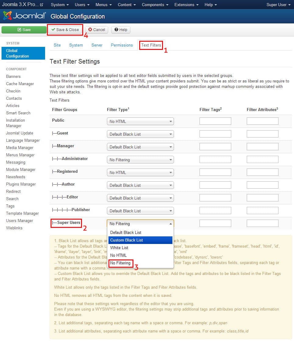 Step 3: Now on the Global Configuration page, click on the “Text Filters” tab. Under the “Text Filter Settings“, set “Filter Type” to “No Filtering” for the “Super Users” user group. Then click on “Save & Close” button at the top to save the changed settings. (Check the below picture for better reference.)
