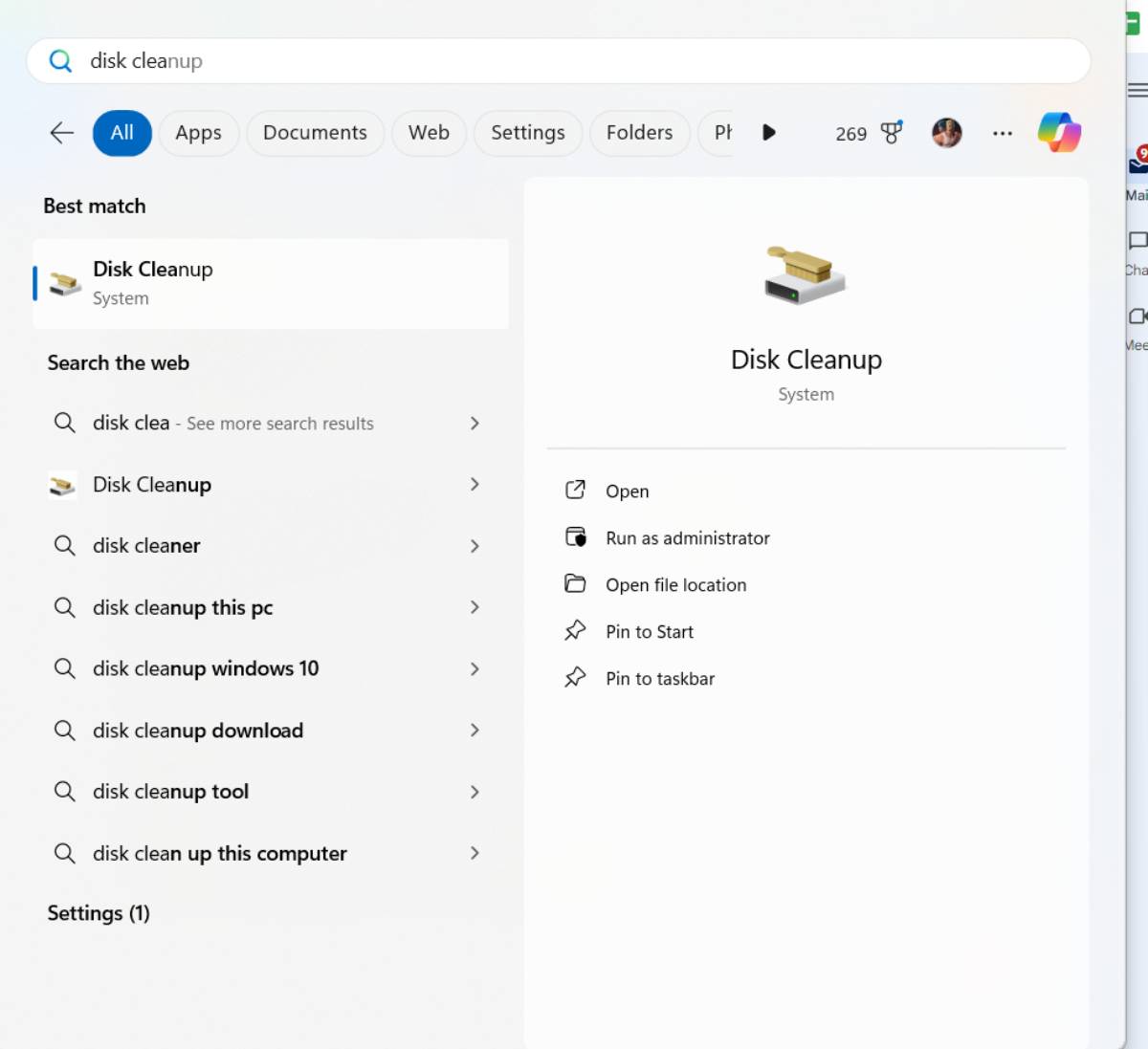 In the Windows search bar, type Disk Cleanup. Click on Run as administrator from the right-hand side.