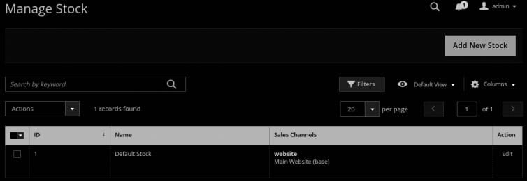Select the ‘Manage Stock’ and select ‘Add New Stock’ to create stocks for your Magento websites.