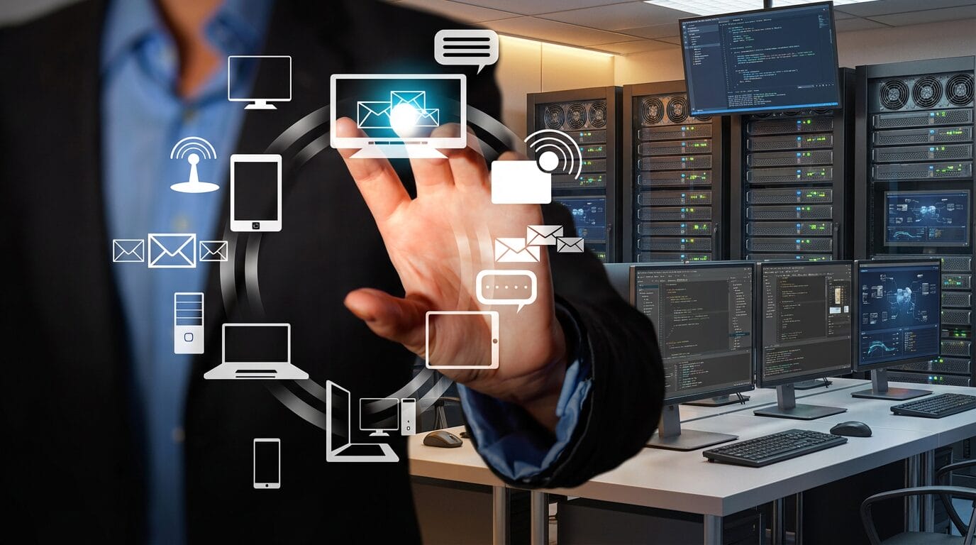 A person interacts with digital communication icons on a transparent screen, with computer servers and monitors in the background.