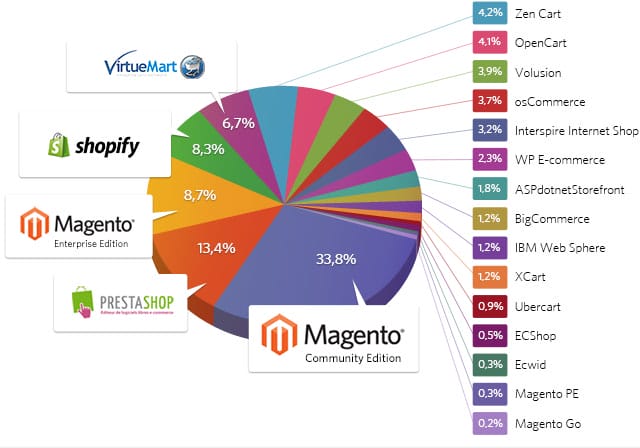 This is the comparative study of eCommerce platforms of 2014 where Magento has largest share almost about 34%. Magento Community Edition has share of 33.8% and Enterprise Edition covers 8.7% share out of all. PrestaShop takes second place after Magento CE.