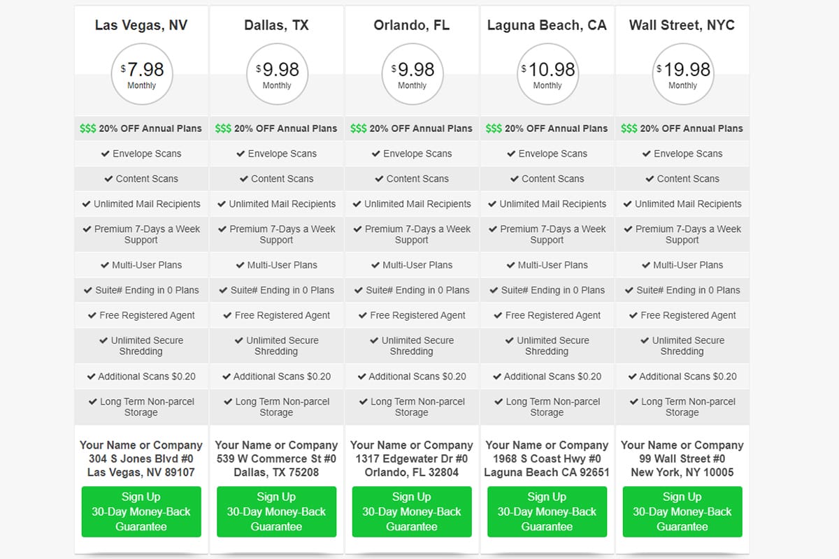 With PhysicalAddress.com you can purchase Virtual Business Address at price as low as $7.98/mo. The agency offers four different plans and you can check them out during the signup process. Companies who wish to enroll for a corporate or high volume plan can get in touch with the support staff of PhysicalAddress.com. If you are pondering over a customized plan then the agency can help you to get it done.