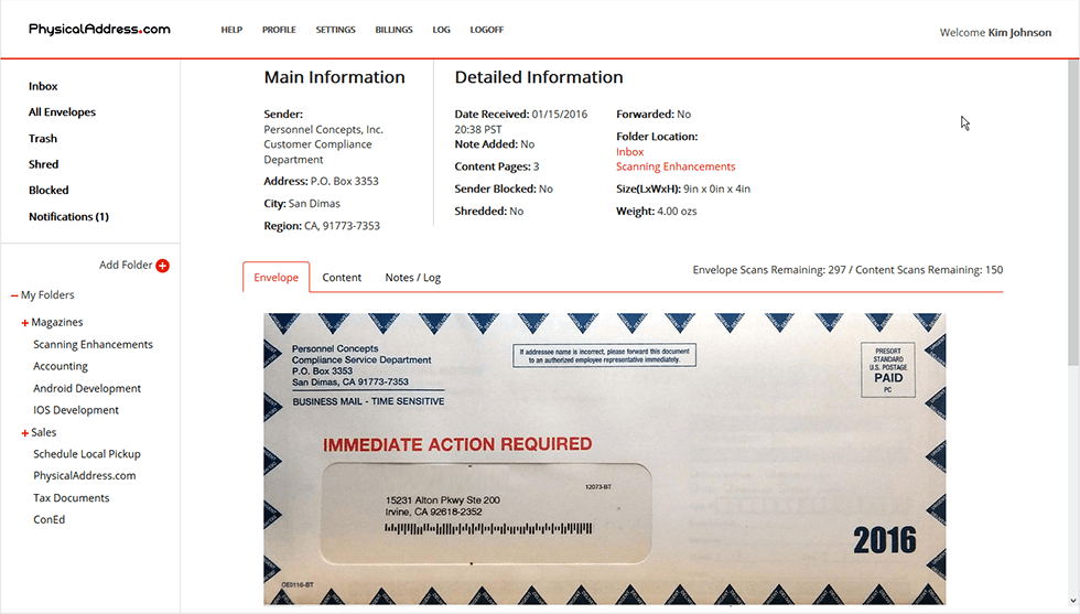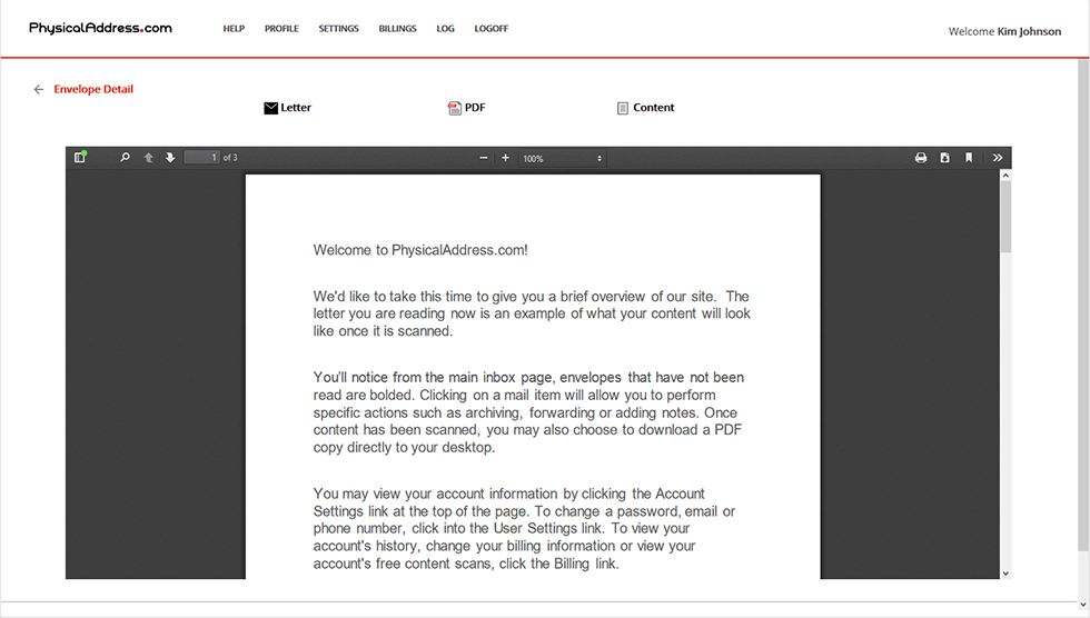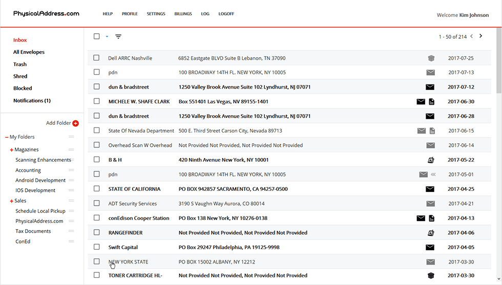- When a new item or a package is added to your inbox, you will get an email or notification with a link to a scanned package or envelope. In case, you have installed the app of PhysicalAddress.com, you will get a direct notification on your Smartphone.