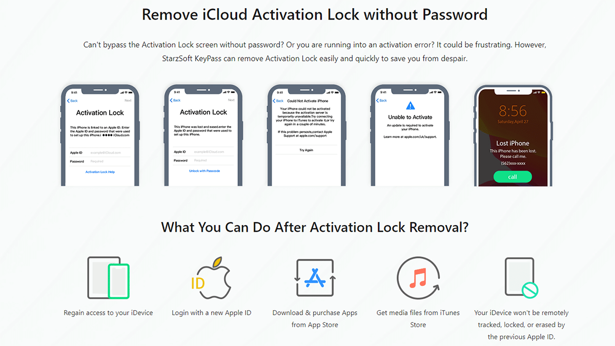 By using StarzSoft KeyPass, iPhone users can remove iCloud/Apple Activation Lock without using their Apple ID and password.