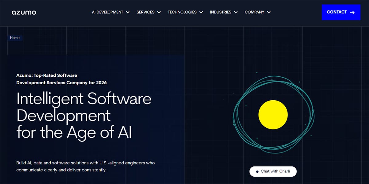 Azumo website homepage featuring a headline about AI software development and a graphic of a yellow circle with blue circular lines.