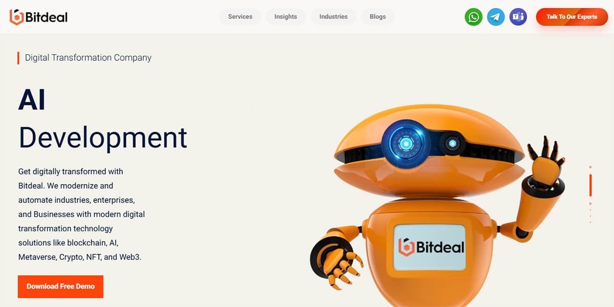 Screenshot of Bitdeal’s website homepage showing an orange robot and text promoting AI development services with a Download Free Demo button.