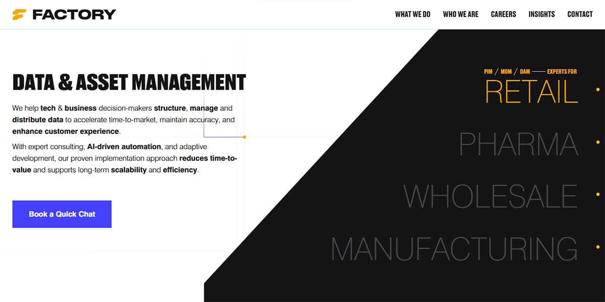FACTORY is a Croatian software development company founded in 2012, ISO 9001 and ISO 27001 certified, and recognized by Clutch as a Top 1000 Global B2B Service Provider. As a Pimcore Gold Partner, FACTORY specializes in data and asset management, PIM systems, eCommerce platform development, and digital experience platforms with AI and data tool integrations. Its 50+ person globally distributed team has delivered for clients including Air Serbia, Krka, and AL-KO KOBER Group.