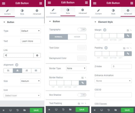 With all the elements you add to your design, you will get more or less the similar options displayed in the above images. You can find these options in the left sidebar. All you need to do is to click on Content, Style and Advanced tabs displayed on top of the images.