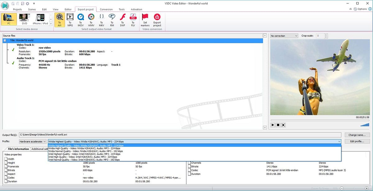 VSDC has a built-in video converter, and because of that, it easily opens all the video formats and codecs including videos in high resolution and 4K. There are no format restrictions in the free version of the tool. And once you’ve finished with the project, you’re free to choose among various export profiles based on your needs. For instance, you can manually set up all the properties, such as format, codec, quality, width and length, framerate, resolution, etc. Alternatively, you can make use of the pre-configured export profiles – for publishing video on YouTube and other social media platforms, or for watching it on a PC in high quality.