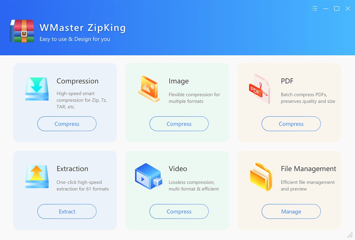 WMaster ZipKing is a comprehensive file compression and extraction software. It is a simple and powerful tool that is used by Windows users. It works with over 61 file types, common ones like ZIP, RAR, 7Z, TAR, and GZIP, and special ones like XZ, BZ2, WIM, JAR, CAB, and TGZ, etc. So you can quickly shrink or open files with just one click.
