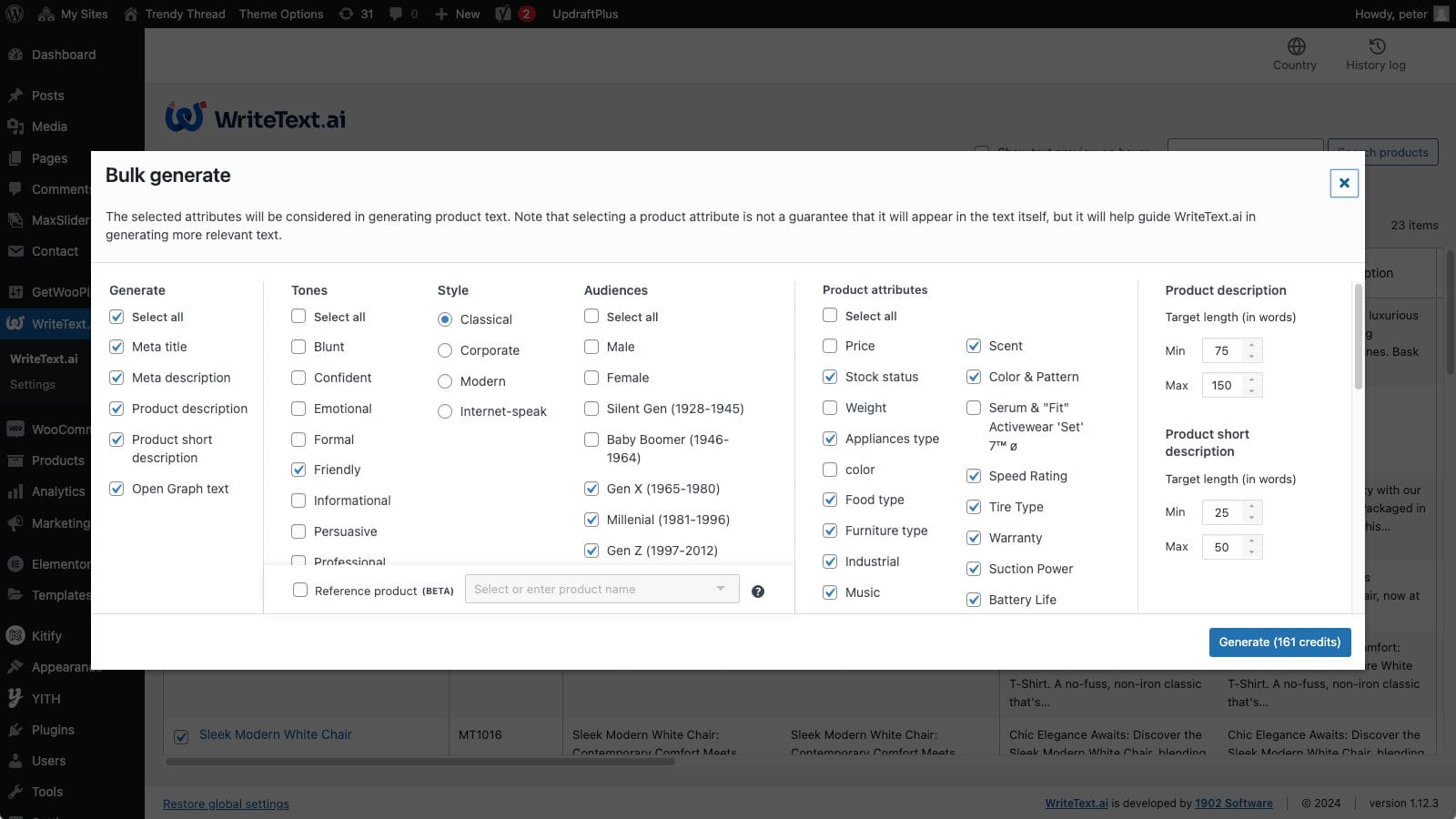 WriteText.ai is a WordPress/WooCommerce plugin that creates meta titles, meta descriptions, product descriptions, Open Graph texts, and image alt texts. It comes with two operational modes: